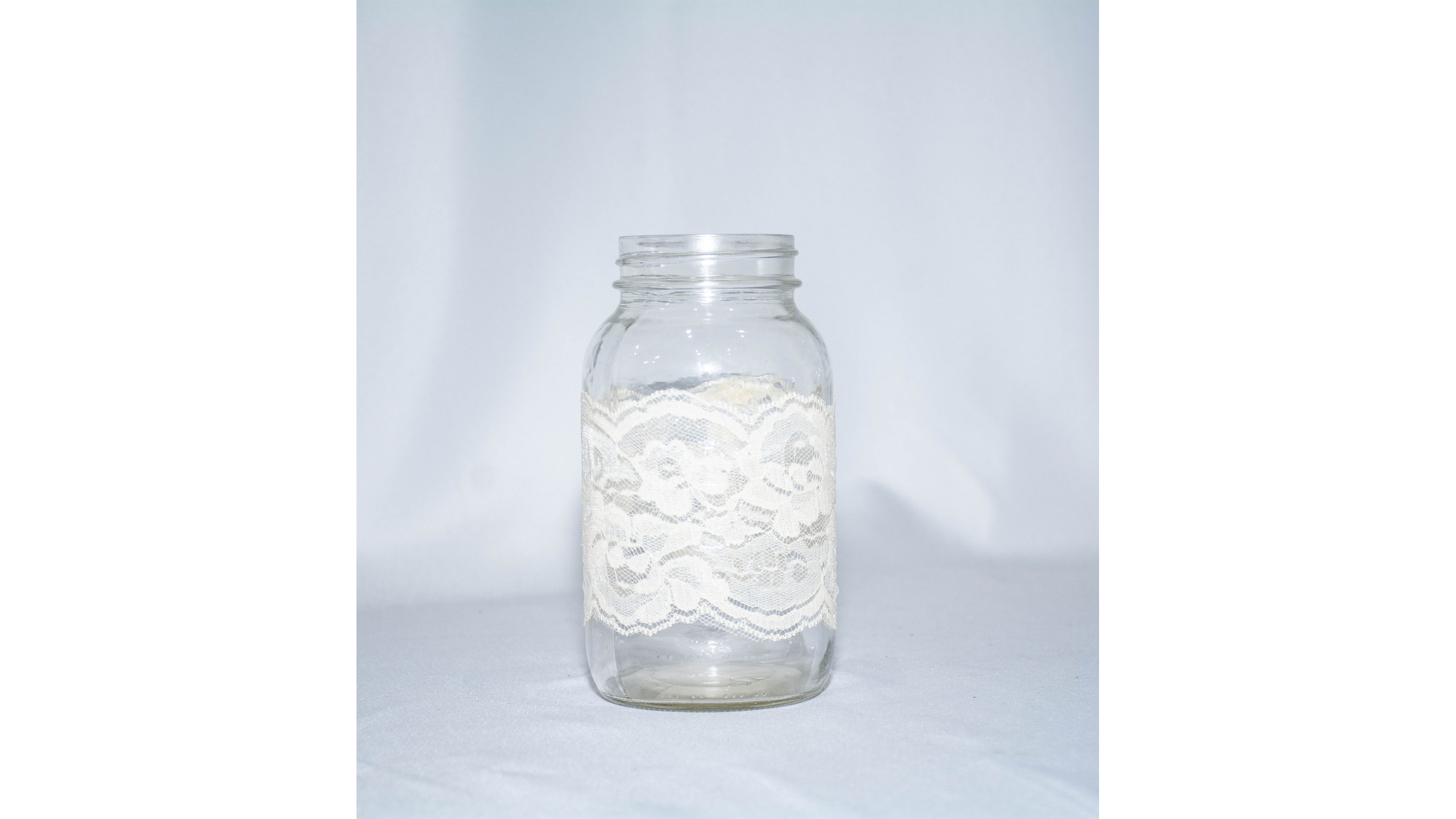 VASE, MASON JAR LACE WRAPPED 7″